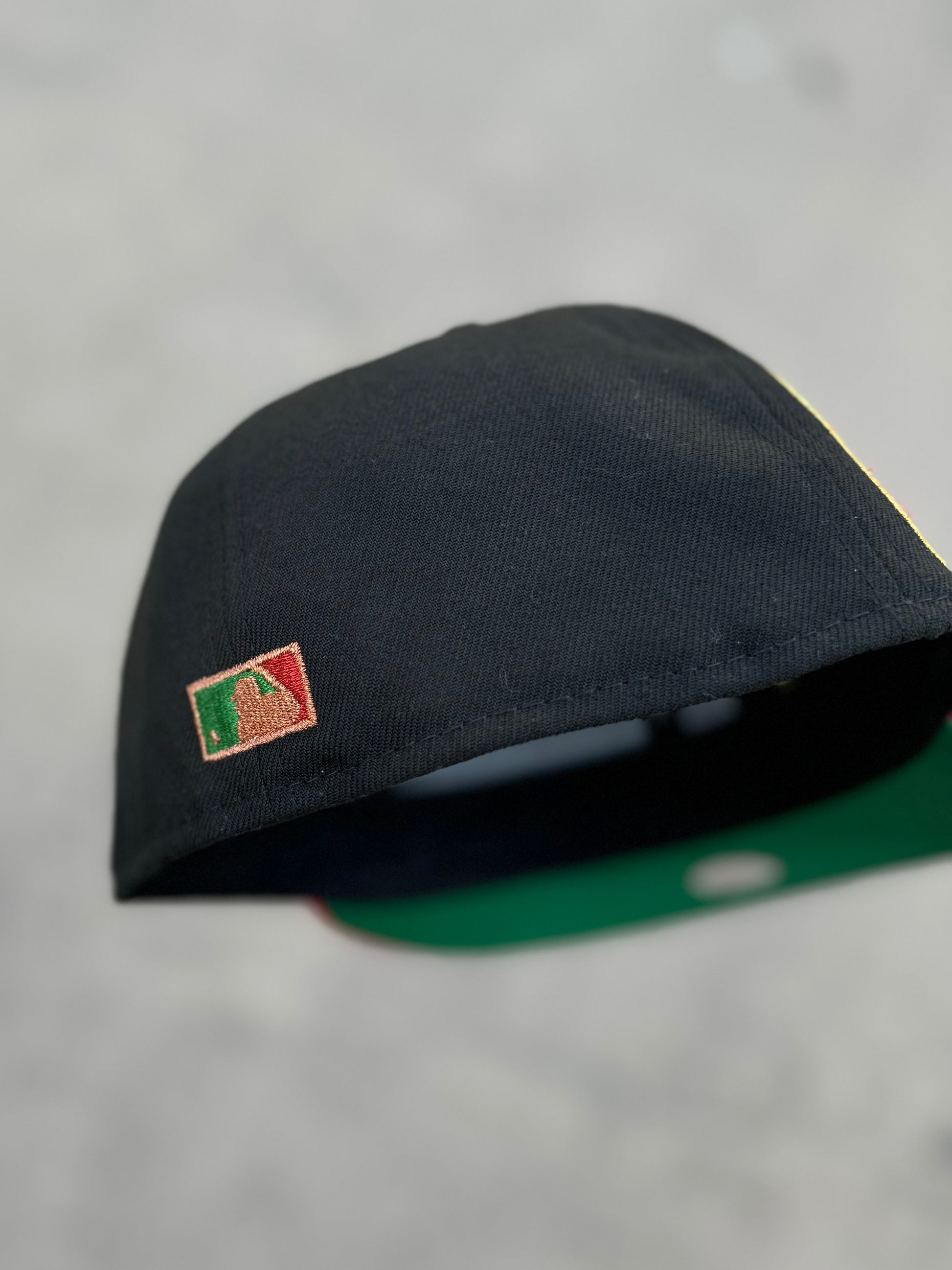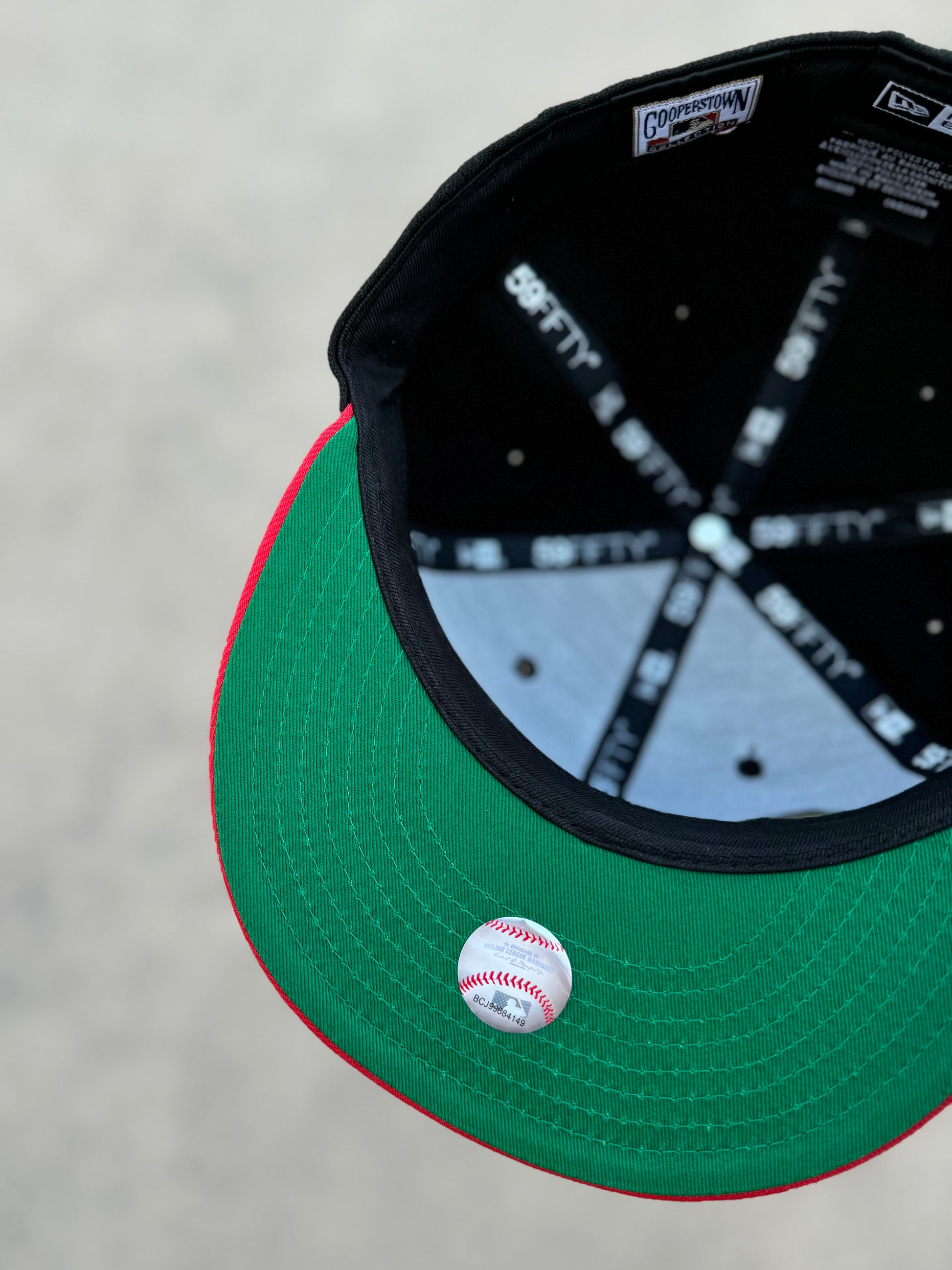 Baltimore Orioles New Era 5950 fitted hat. Black/Front Door Red 2tone. Kelly Green UV. Metallic Copper, Metallic Red, Metallic Gold Rush, Shamrock Green, Holly Leaf, Seashell, Merit Gold, Real Black, Countdown Orange and Snow White stitching. Black Sweatband. Made In Bangladesh. 100% Polyester.