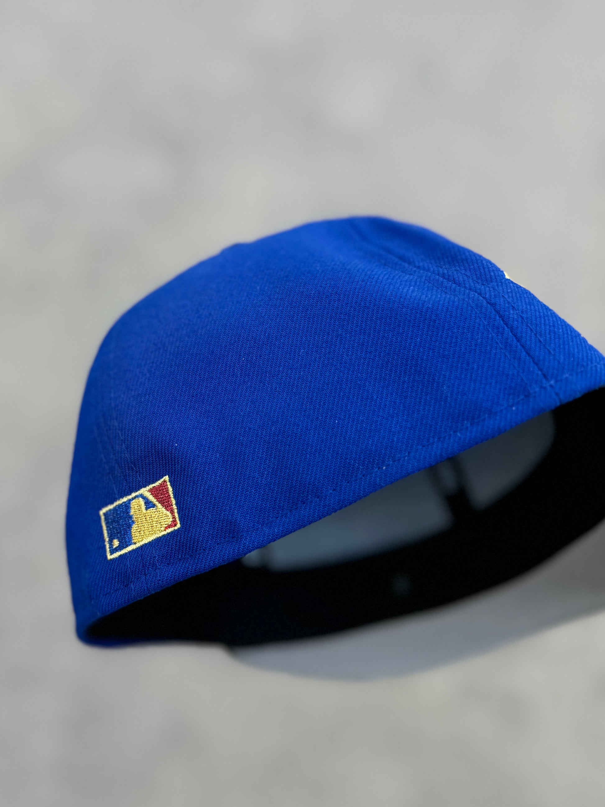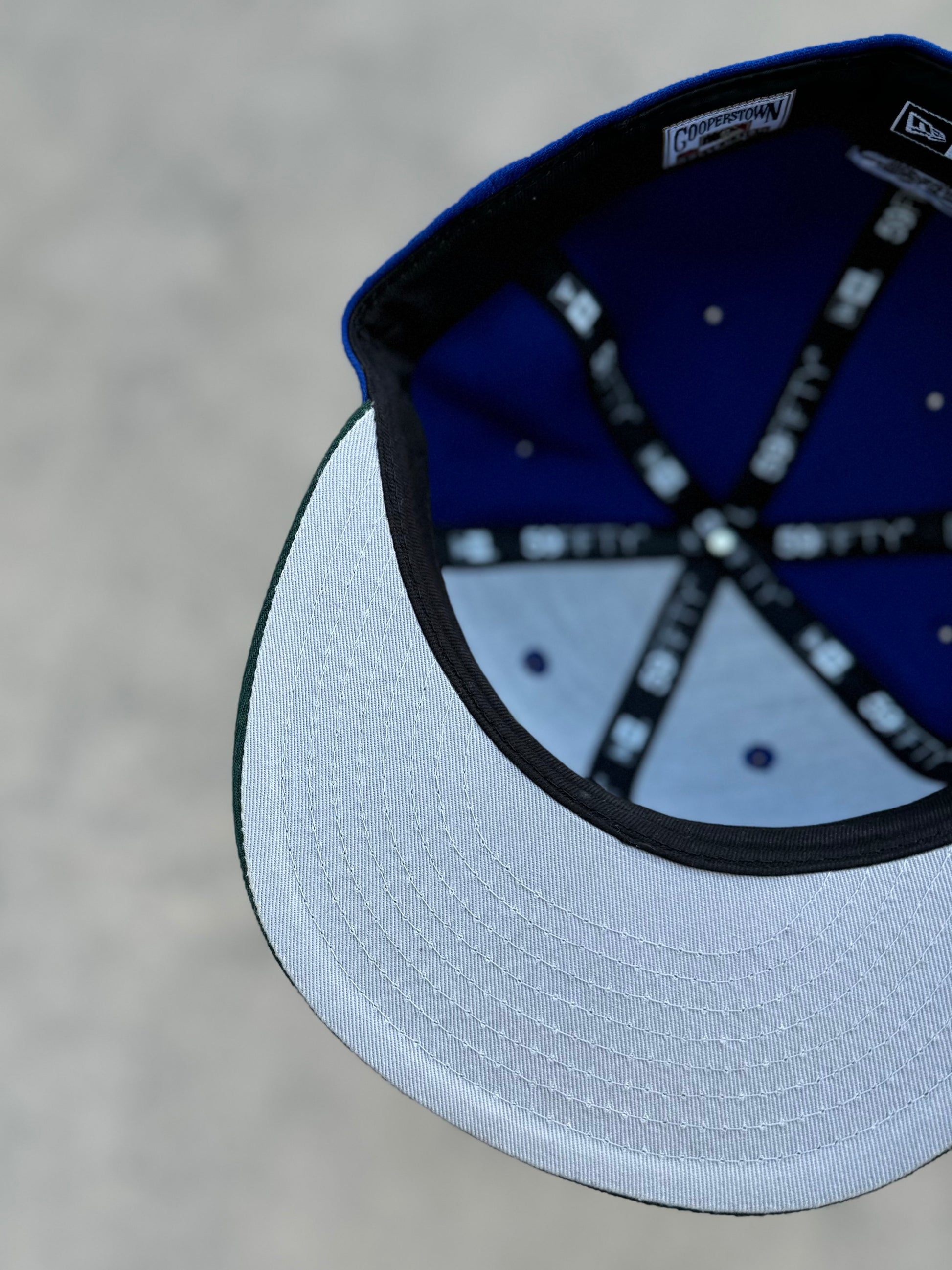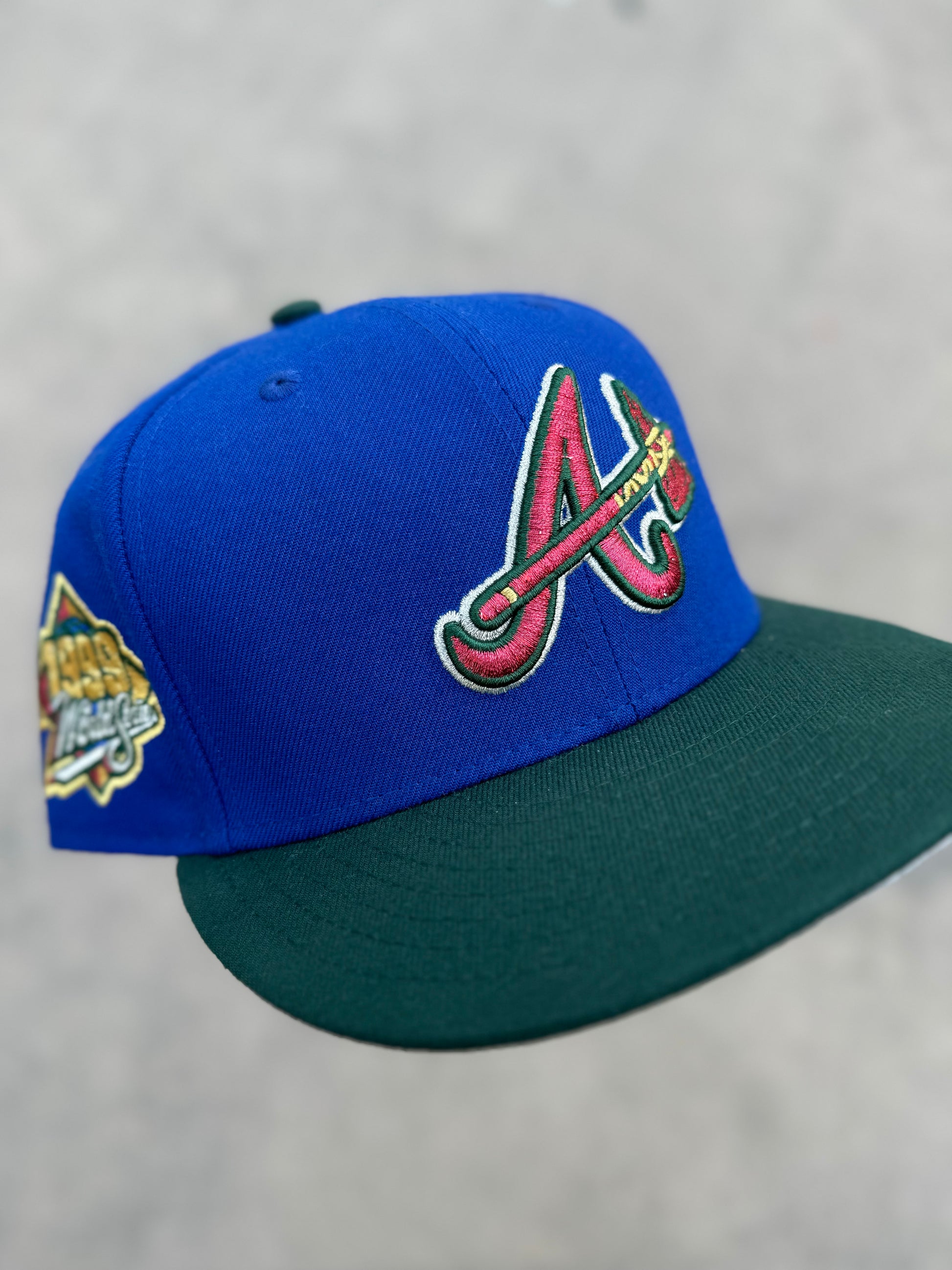 Atlanta Braves New Era 5950 fitted hat curated for our live 99th episode. Royal Blue/Dark Green 2tone. Grey UV. Metallic Red, Metallic Silver, Metallic Gold, Dark Green and Royal stitching. Black Sweatband. Made In China. 100% Polyester.